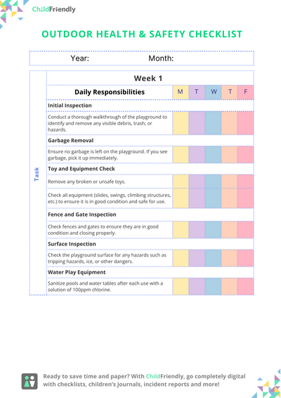 Keep your playground safe and staff organized with ChildFriendly’s Outdoor Health & Safety Checklist template. Designed for childcare professionals, this PDF guides you through essential daily inspections—including clearing debris, checking toys and equipment, inspecting fences and surfaces, and sanitizing water play areas with a 100 ppm chlorine solution.